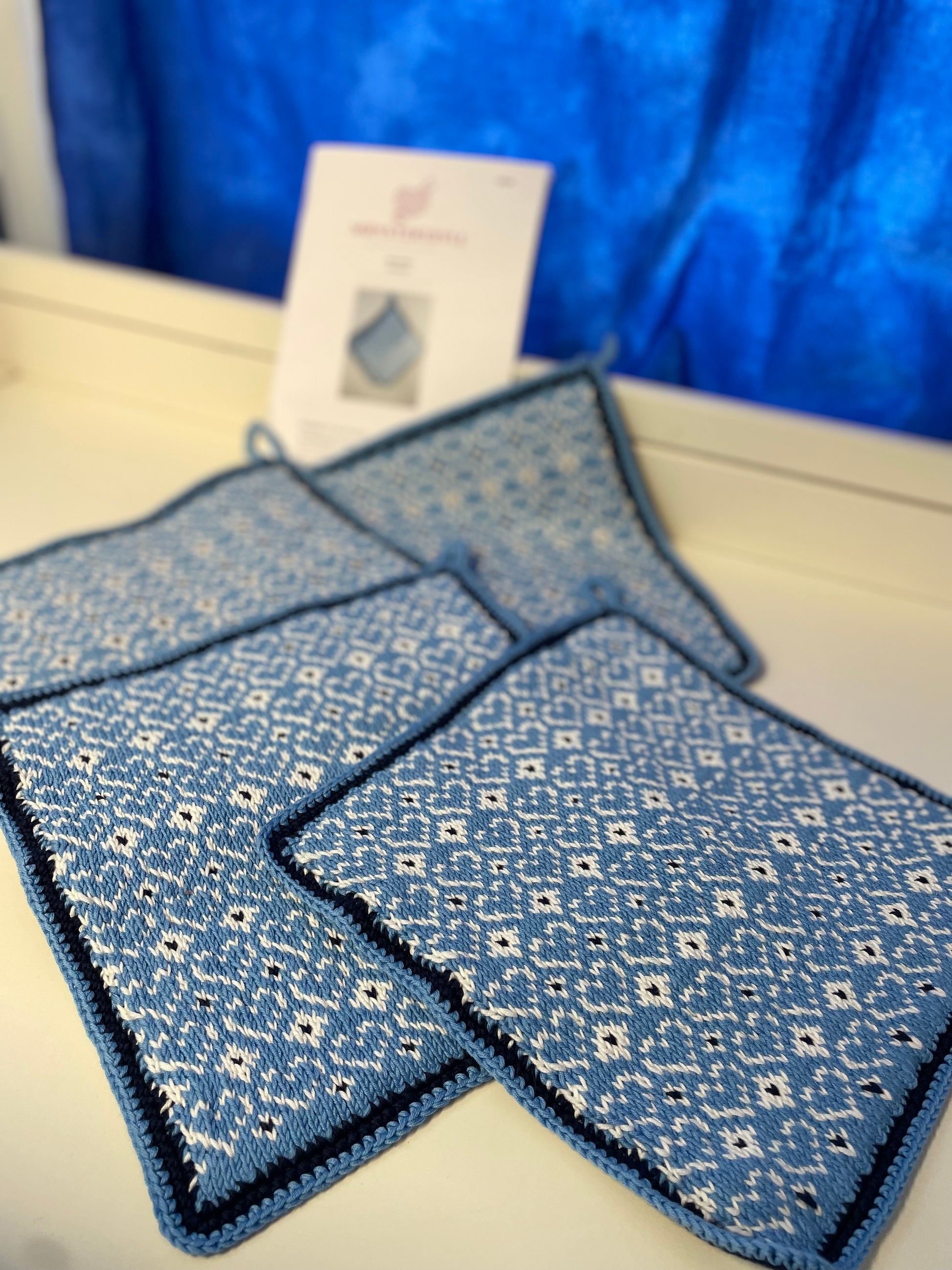 Hefte inneholder også en enkel beskrivelse av hvordan grytekluten strikkes, med fargede diagrammer.